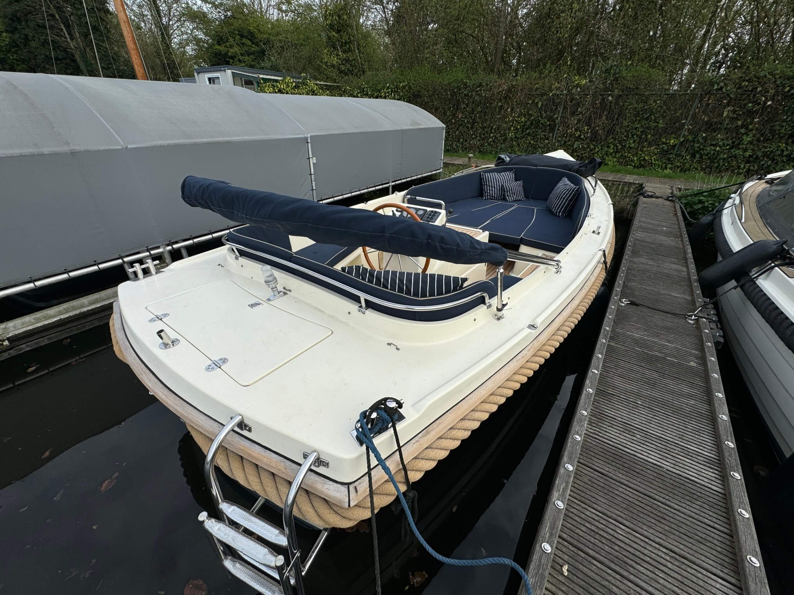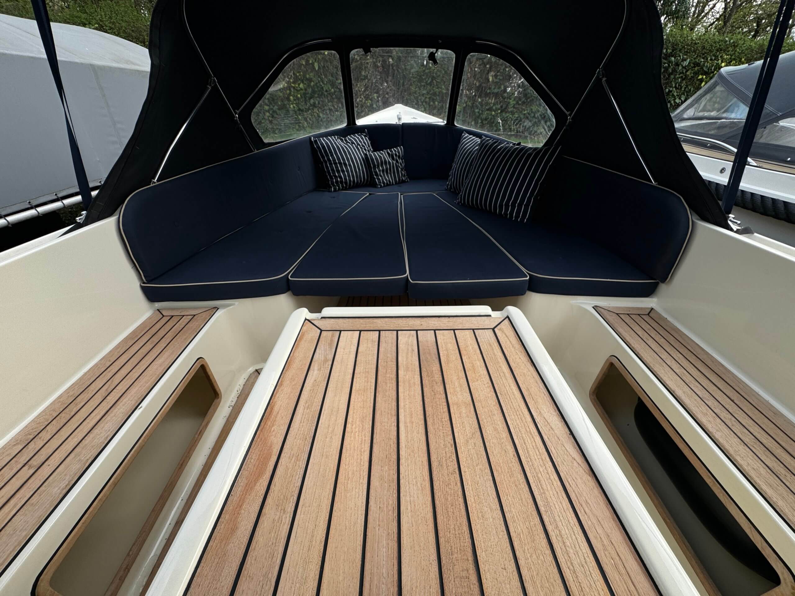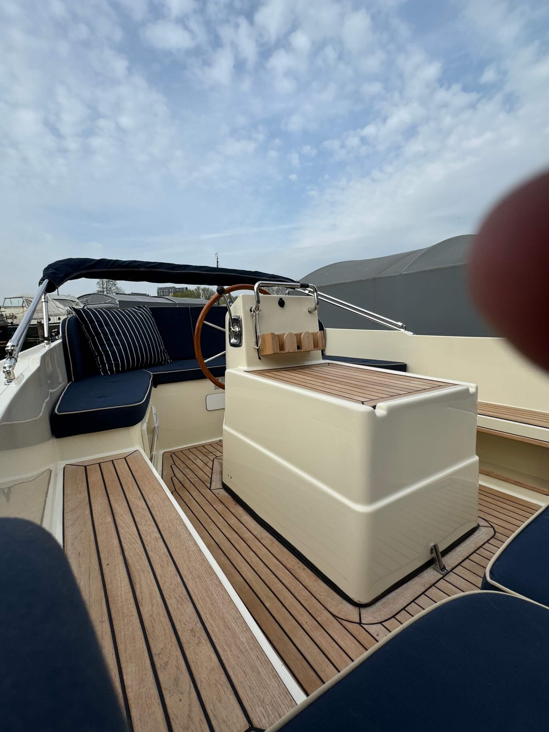 De boot straalt luxe en comfort uit met onder andere een fraaie teakhouten vloer en een complete navy blauwe kussenset, inclusief planken en kussens voor een ruim ligbed. De stijlvolle navy blauwe bimini met hoes en de luxe buiskap (op maat gemaakt door Zeilmakerij Jan Schooker uit Volendam). Met drie kunststof ramen en losse panelen die met klittenband bevestigd kunnen worden, waardoor de boot volledig afgesloten en verduisterd kan worden.