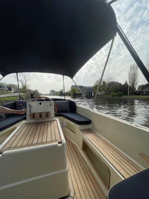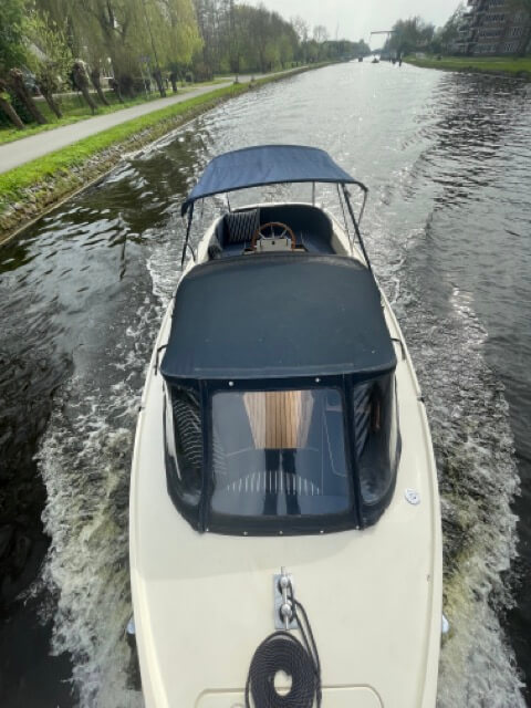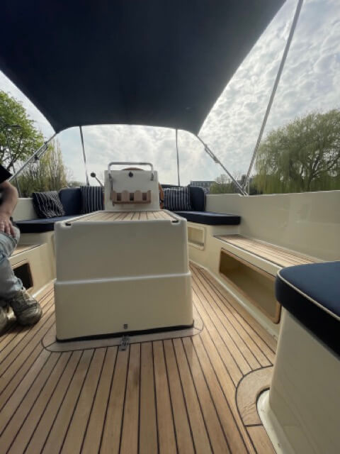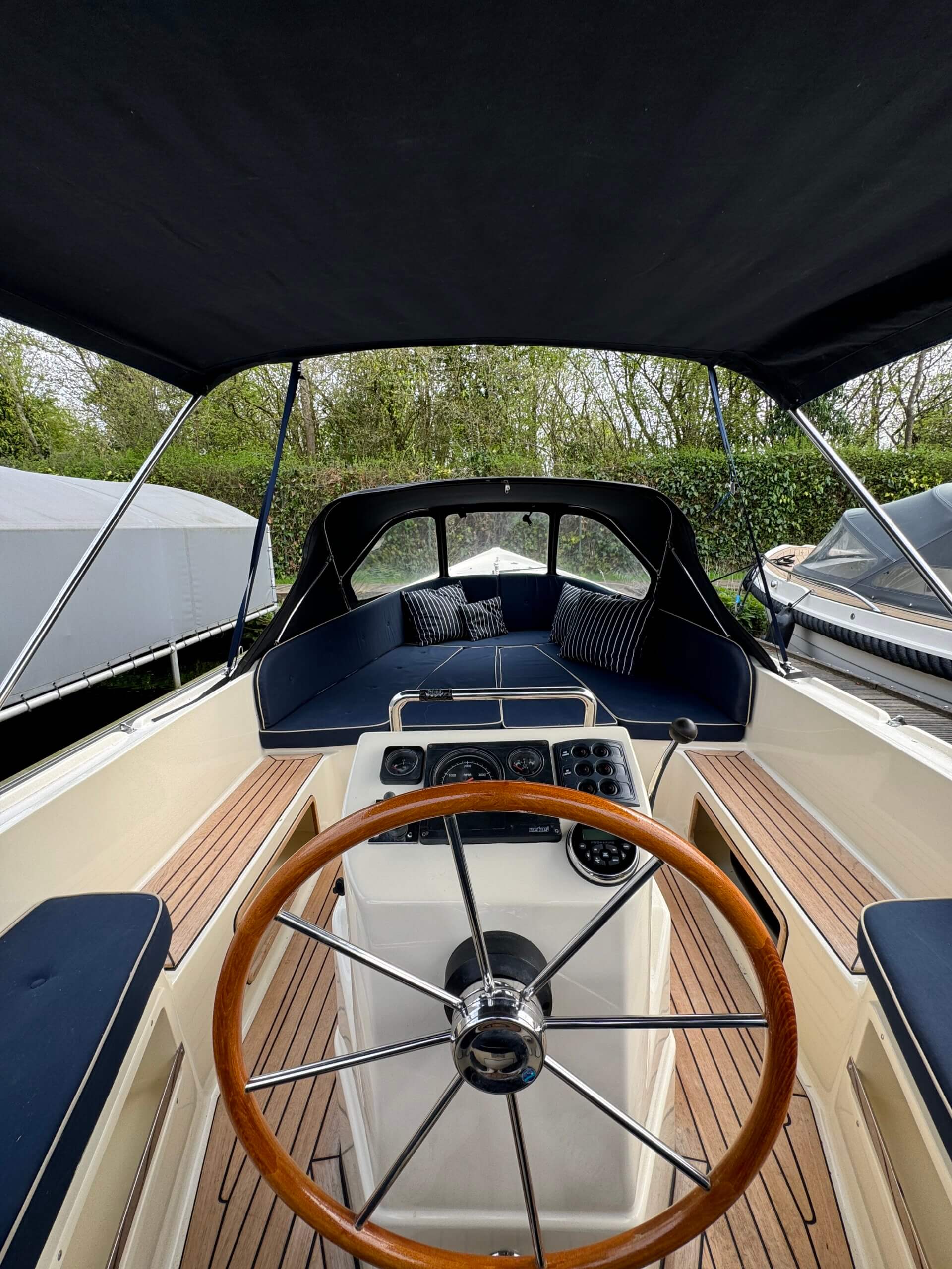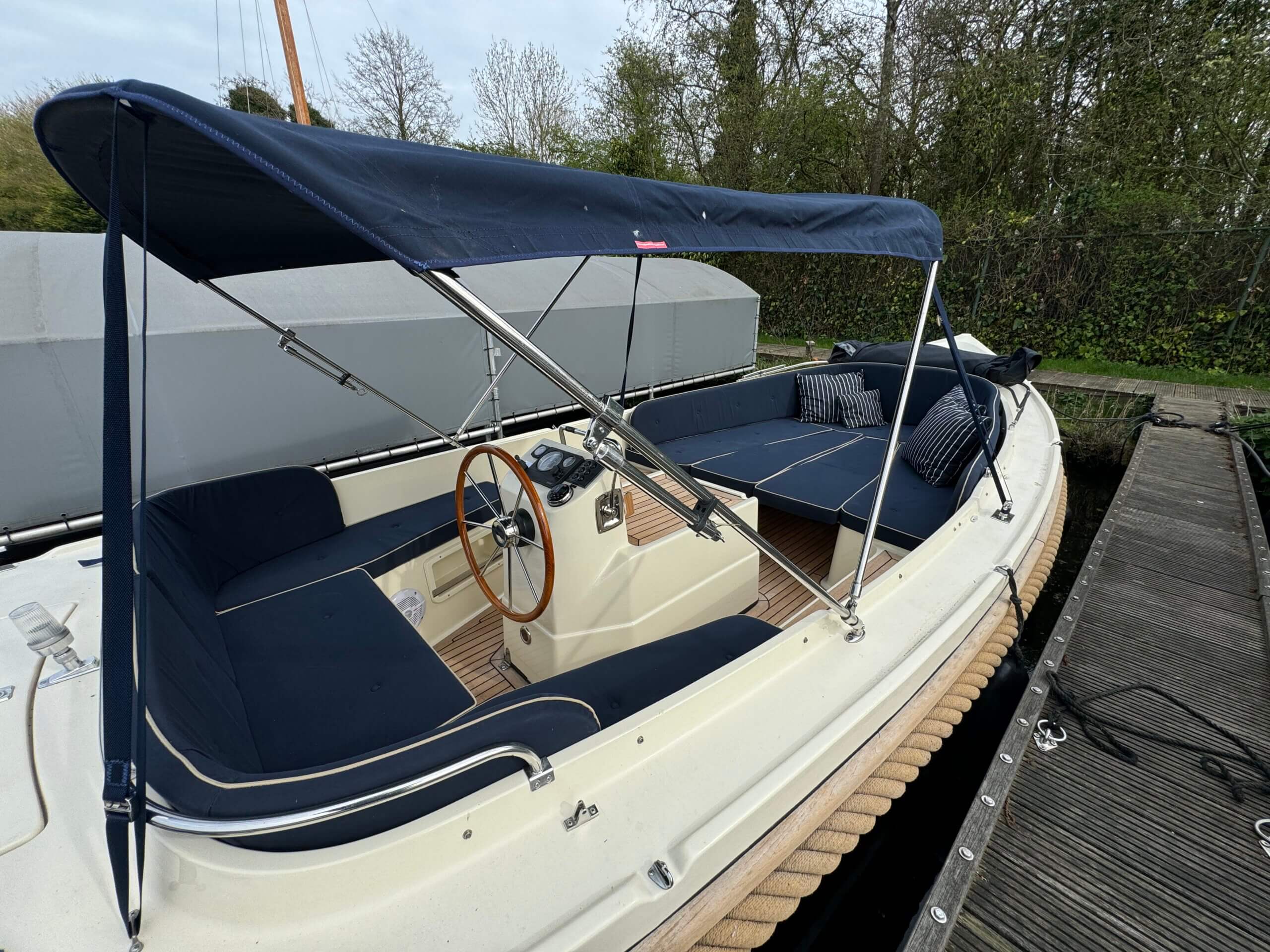 De boot straalt luxe en comfort uit met onder andere een fraaie teakhouten vloer en een complete navy blauwe kussenset, inclusief planken en kussens voor een ruim ligbed. De stijlvolle navy blauwe bimini met hoes en de luxe buiskap (op maat gemaakt door Zeilmakerij Jan Schooker uit Volendam). Met drie kunststof ramen en losse panelen die met klittenband bevestigd kunnen worden, waardoor de boot volledig afgesloten en verduisterd kan worden.