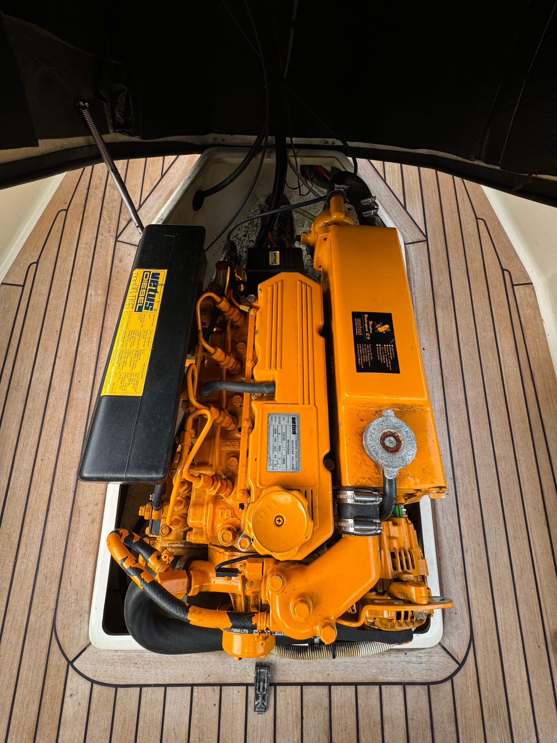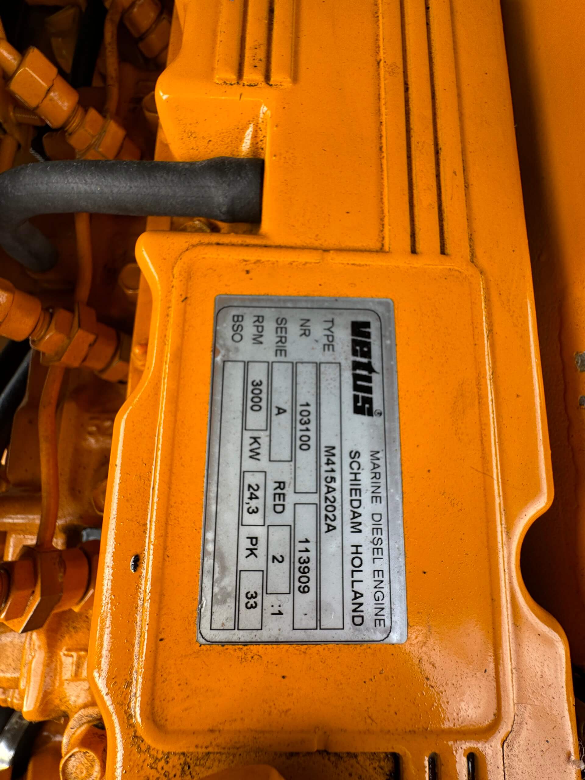 De sloep is uitgerust met een betrouwbare Vetus M4.15A202A dieselmotor van 33 PK, maart 2026 voorzien van een onderhoudsbeurt. Dankzij de boegschroef (35 KG Vetus) is manoeuvreren eenvoudig en comfortabel. Het onderwaterschip is maart 2026 behandeld, wat bijdraagt aan een goede staat en zorgeloos gebruik.