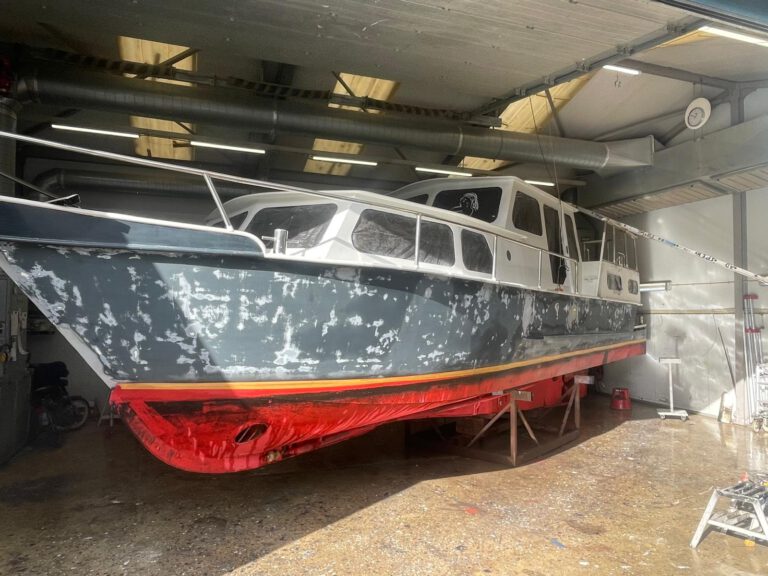 Na drogen gaat de boot naar binnen in een van onze loodsen en beginnen we met demonteren van uw beslag en schuren, plamuren en schilderen een of meerdere lagen waar nodig en zoals afgesproken.